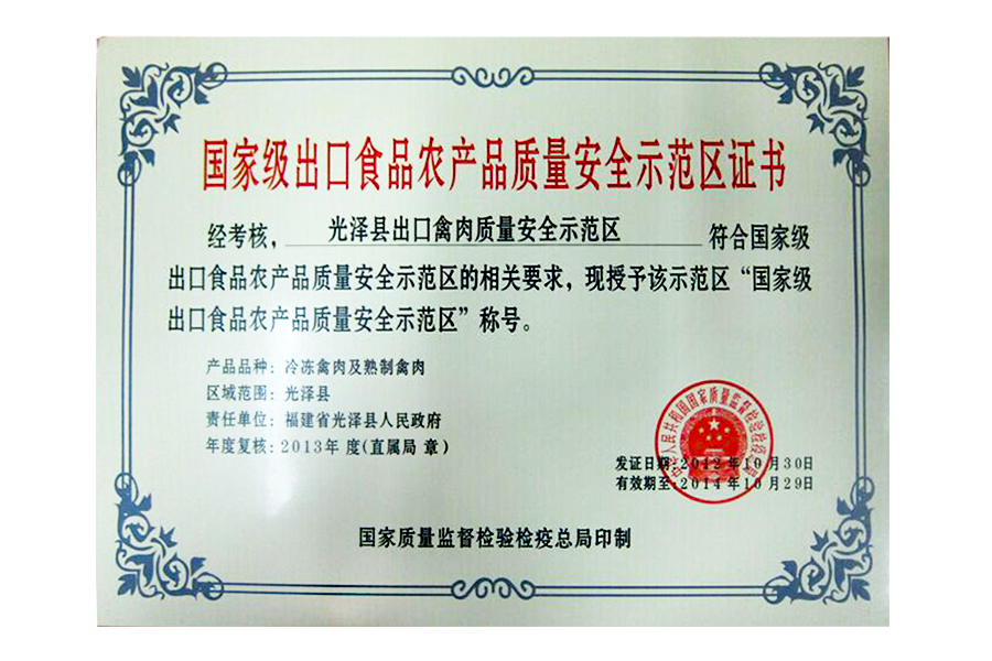 • 2012年国家级出口食品农产品质量安全示范区证书