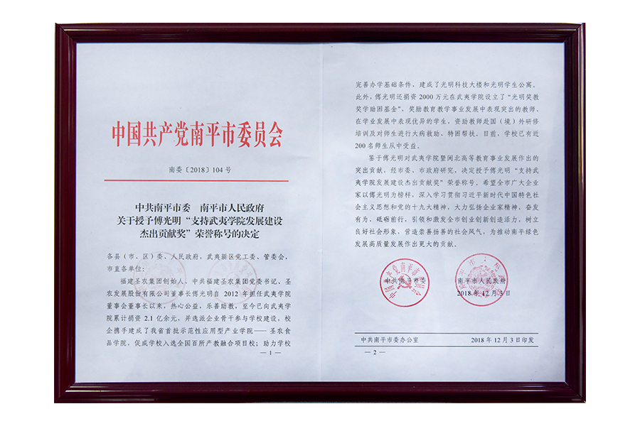 • 2018年中国南平市委下发通稿(支持武夷学院发展建设杰出贡献奖)